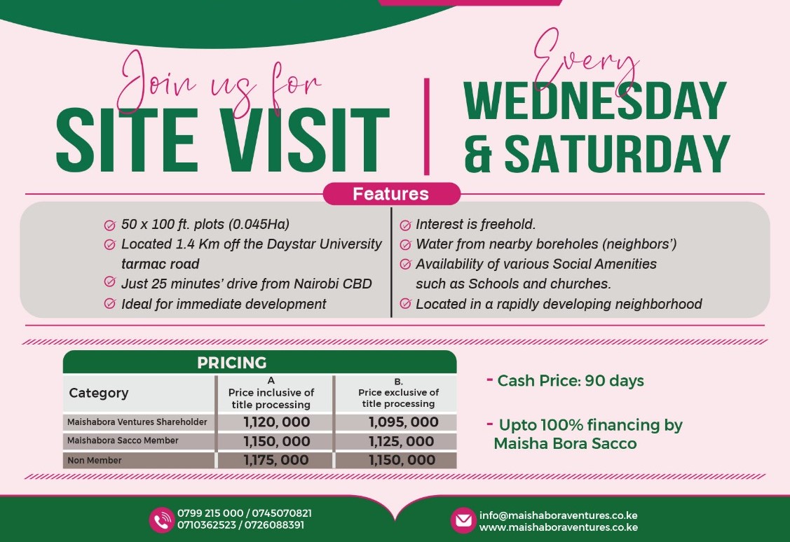 This is a prime project designed for residential use located 1.4 Km off the Daystar University tarmac road with a beautiful scenery overlooking Lukenya Hills, ideal for immediate development, just 25 minutes’ drive from Nairobi CBD